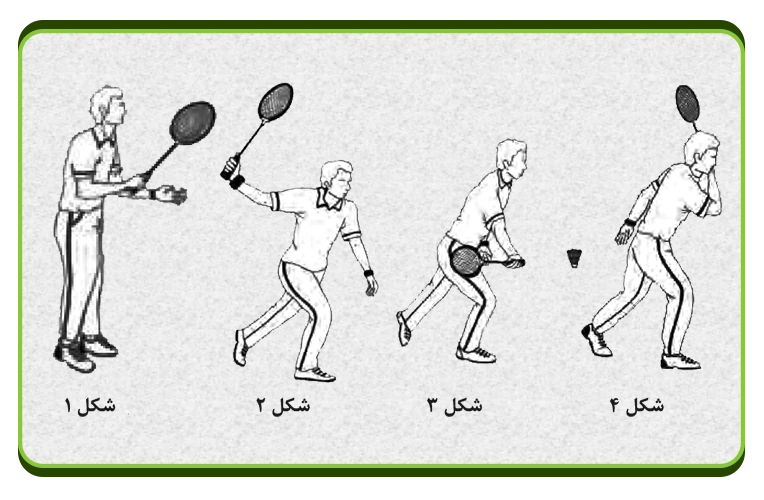 تمرین سایه زنی: دانش آموزان به حالت آماده برای دریافت توپ قرار می گیرند. سپس با علامت شماره 1 معلم، پای راست خود را به جلو و دست راست که راکت دارد به طرف عقب می برند. با علامت شماره 2 معلم دستی را که راکت دارد به طرف جلو حرکت داده و توپ را به طور فرضی می زنند. (سایه زنی).