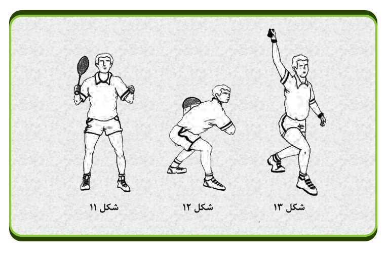 سایه زنی : دانش آموزان به حالت آماده برای دریافت توپ قرار می گیرند (شکل 18 ). سپس با علامت شماره 1 معلم، پای راست خود را در جلو قرار می دهند. در این هنگام دست راست خود را که راکت دارد به طرف چپ بدن می برند. (شکل19).