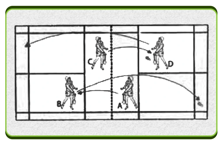 آندرهندکلیر با فورهند و بک هند: بازیکن های A و D ضربه دراپ شات می زنند و بازیکن های B و C جواب آنها را با ضربه آندرهندکلیر با فورهند و بک هند می دهند. پس از 6 دقیقه بازیکن ها جای خود را عوض می کنند.