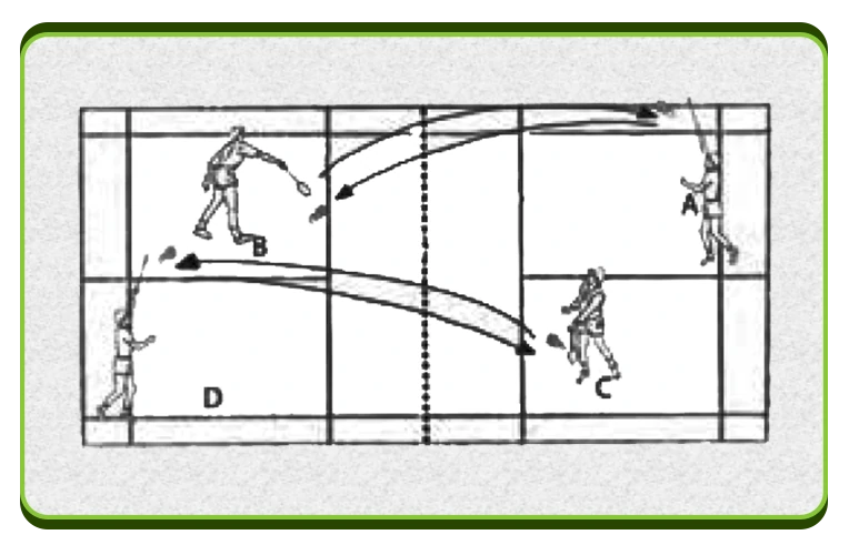 آندرهندکلیر با فورهند: بازیکن های C و A به ترتیب برای بازیکن های D و B با دست توپ را به پشت تور جلوی زمین می اندازند و آنها با روی دست (فورهند) ضربه آندرهند کلیر را می زنند. پس از 6 دقیقه بازیکن ها جای خود را عوض می کنند.