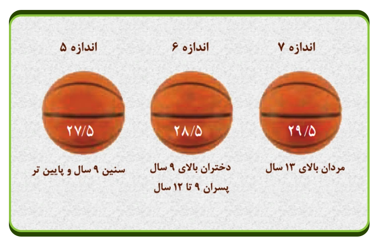 توپ بسکتبال، کروی و نارنجی رنگ است و جنس آن از چرم، پلاستیک و یا مواد مصنوعی است. محیط توپ کمتر از 75 سانتی متر و بیش از 78 سانتی متر نیست . وزن توپ حداقل 567 گرم و حداکثر 650 گرم است. اگر توپ به میزان مناسب باد شود، وقتی آن را از ارتفاع 80 / 1 متر رها کنیم، پس از برخورد با زمین بازی تا ارتفاع 20 / 1 ( حداقل ) یا 1/40 ( حداکثر ) بالا می آید.
