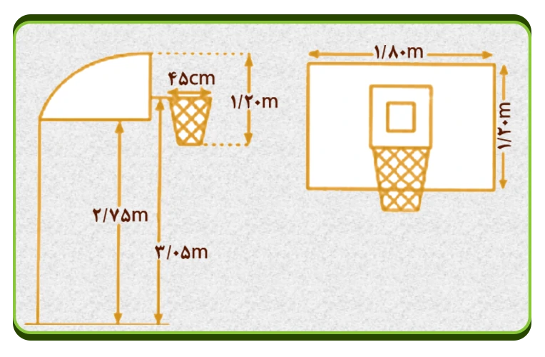 حلقه باید محکم به تخته وصل شود تا هنگام اعمال فشار بر حلقه، فشار به روی تخته منتقل نگردد. ارتفاع حلقه از سطح زمین 05 / 3 متر و فاصله حلقه تا تخته 15 سانتی متر است.
