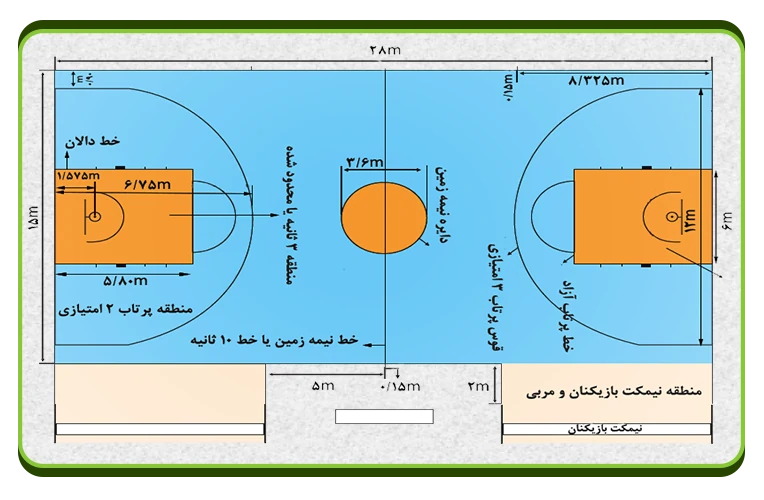 برای تورنمنت های المپیک و قهرمانی جهان، زمین بسکتبال باید 28 متر طول و 15 متر عرض داشته باشد. برای سایر مسابقات و رقابت ها این ابعاد می توانند متفاوت در نظر گرفته شوند که تابع قوانین فدراسیون بسکتبال است.
